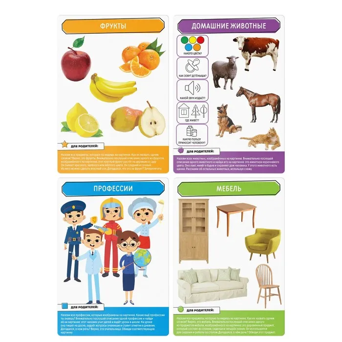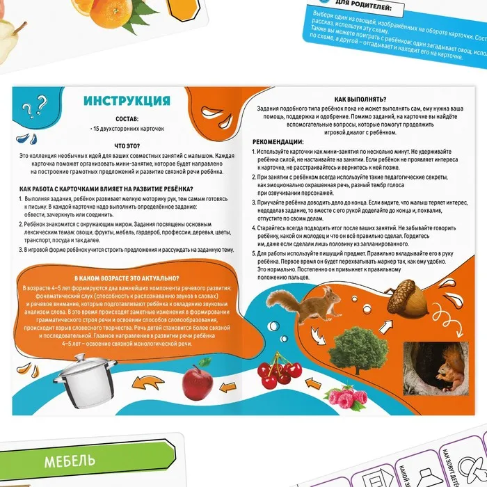 Каждая карточка поможет организовать мини-занятие, которое будет направлено на построение грамотных предложений и развитие связной речи ребёнка.