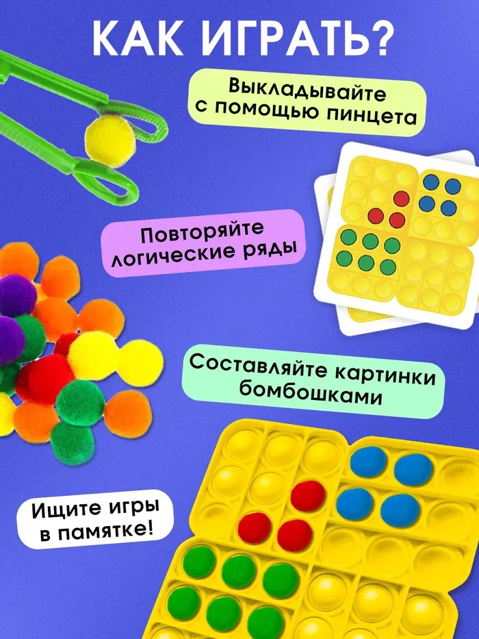 «Нажимай и сортируй» — развивающий набор для детей от 3 лет. Малыш закрепит знание цветов и форм, потренирует навыки счёта и мелкую моторику в игровой форме. В комплект входят 36 ярких цветных бомбошек, резиновая основа, пинцет Монтессори, правила игры и 20 увлекательных заданий.