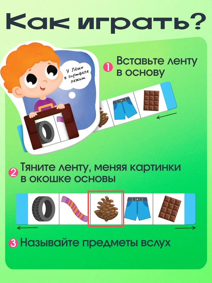 Внутри вы найдёте 6 игровых основ, 18 пластиковых лент и памятку для родителей.