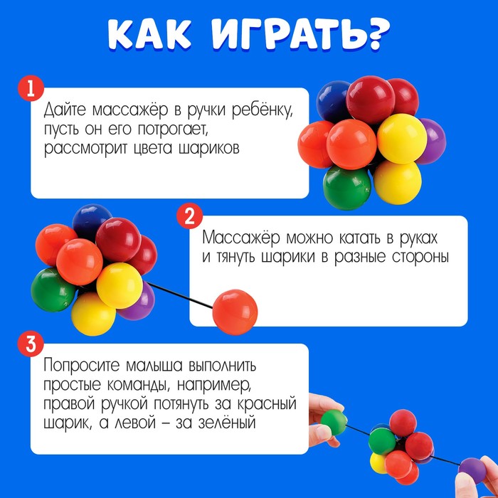 • Дайте массажёр в ручки ребёнку. Пусть он его потрогает, рассмотрит цвета шариков.