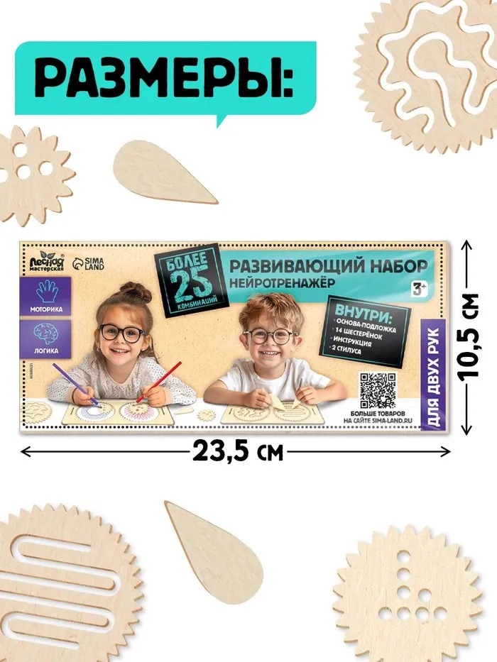 Развивающий набор «Нейротренажёр. Шестерёнки» предназначен для детей от 3 лет. Этот набор помогает развивать мелкую моторику, логическое мышление и координацию движений. Нейротренажёр состоит из деревянных элементов, безопасных для ребёнка, и предлагает 25 различных комбинаций.