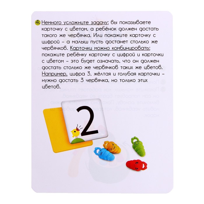 - Возьмите карточку и попросите кроху собрать червячков соответствующего цвета или количества.