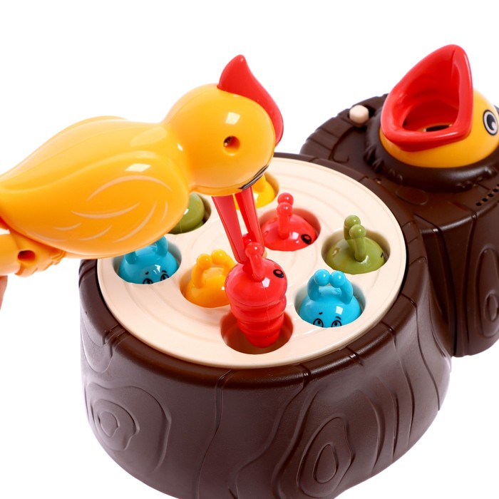 Малыш с помощью птенца достанет всех червячков из дерева (игровой основы).