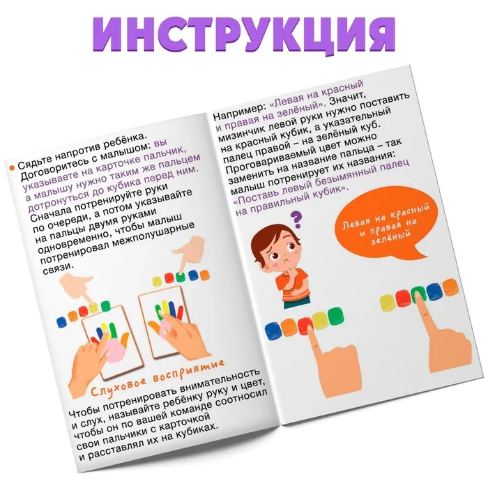 - Чтобы потренировать внимательность и слух, называйте ребёнку руку и цвет, чтобы он соотносил свои пальчики с карточкой и расставлял их на кубиках. Например: «Левая на красный и правая на зелёный». Значит, мизинчик левой руки нужно поставить на красный кубик, а указательный палец правой — на зелёный куб.