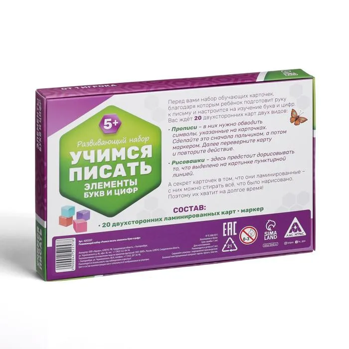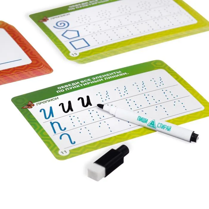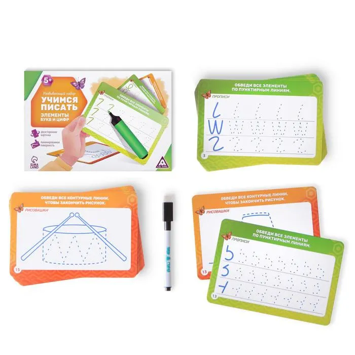Развивающий набор пиши-стирай «Учимся писать элементы букв и цифр», 20 карт, 5+ — Характеристики