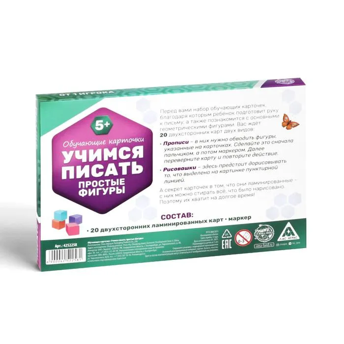 Развивающий набор пиши-стирай «Учимся писать. Простые фигуры», 20 карт, 5+ — Характеристики