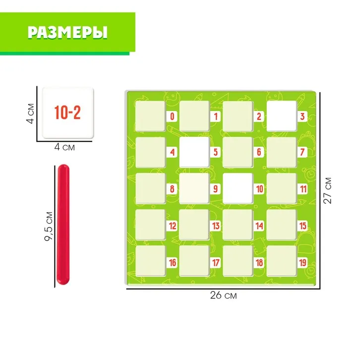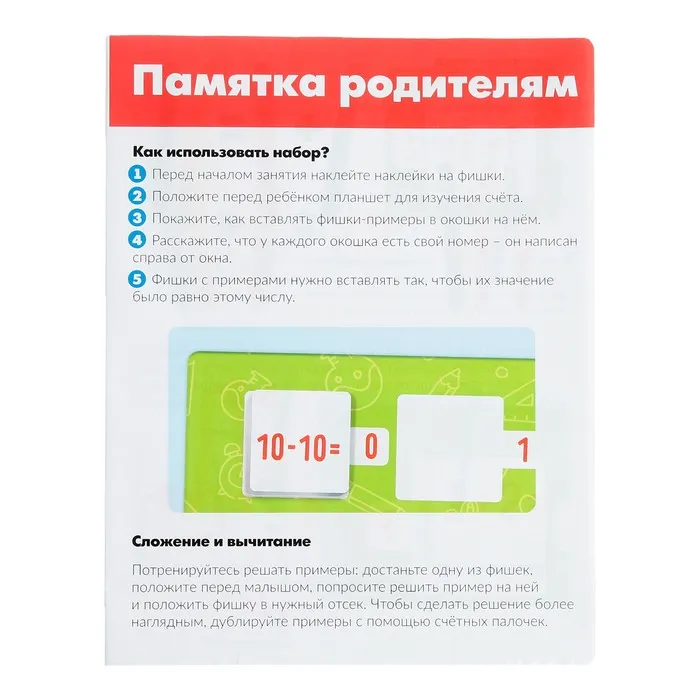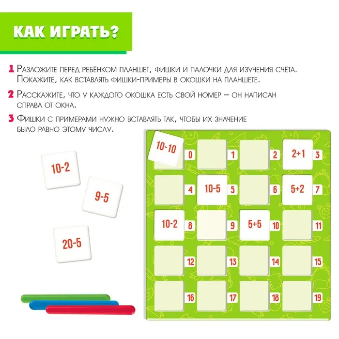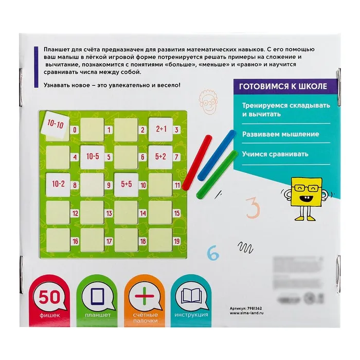 Внутри вы найдёте планшет, 100 счётных палочек, 50 фишек и инструкцию.