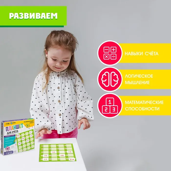 С развивающим набором «Планшет для счёта» ребёнок в лёгкой игровой форме потренируется решать примеры на сложение и вычитание, познакомится с понятиями «больше», «меньше» и «равно» и научится сравнивать числа между собой.