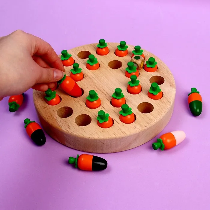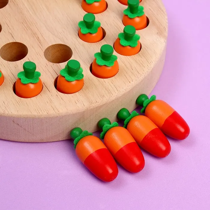 - «Мемори». Предложите крохе самостоятельно заполнить поле морковками. Затем ему предстоит доставать по 2 морковки, если цвет обеих совпал — вынимаете их с поля и засчитываете 1 очко. Если цвета разные, задача крохи — запомнить их местоположение, чтобы в дальнейшем их также убрать с поля.