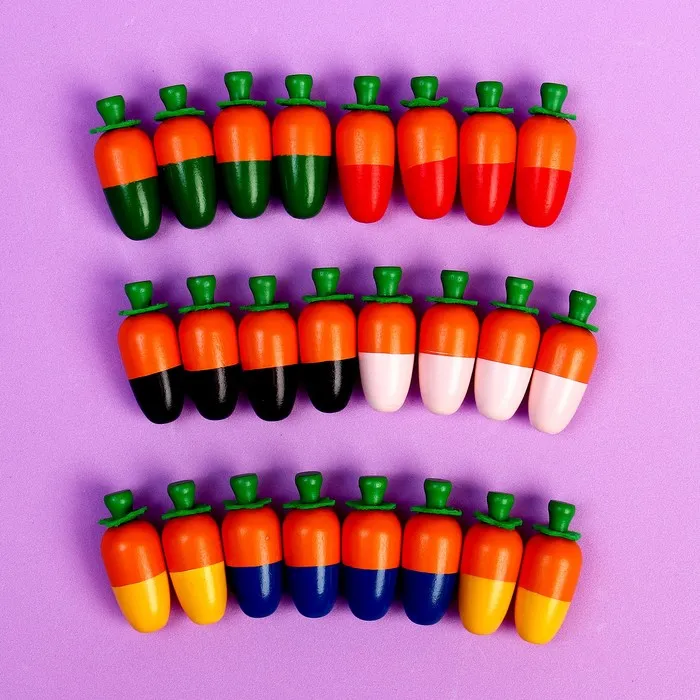 - У каждой морковки есть ручка, за которую ребёнку будет удобно браться пальчиками.