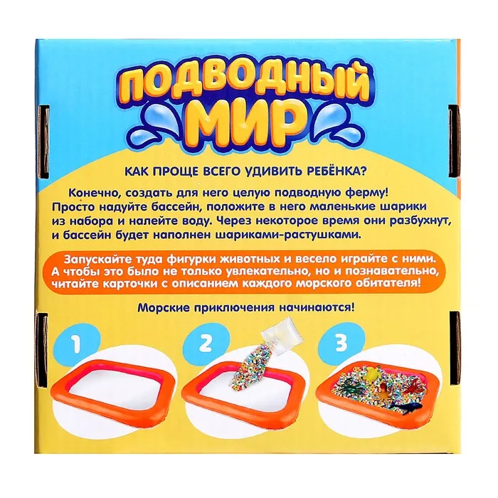 Для игры возьмите шарики и положите в бассейн с водой. Через некоторое время они разбухнут и заполнят всю ёмкость. Запускайте туда морских зверей и весело играйте с фигурками.