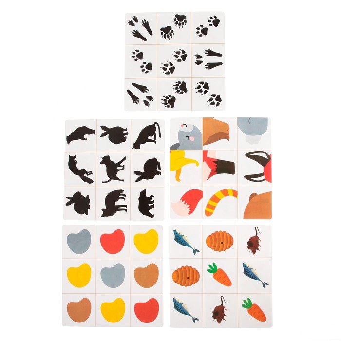• Выполняйте задания с карточек. Например, рассмотрите следы разных животных и определите, кому они принадлежат. Попросите ребёнка найти на карточках части зверят и угадать, кто на них изображён.