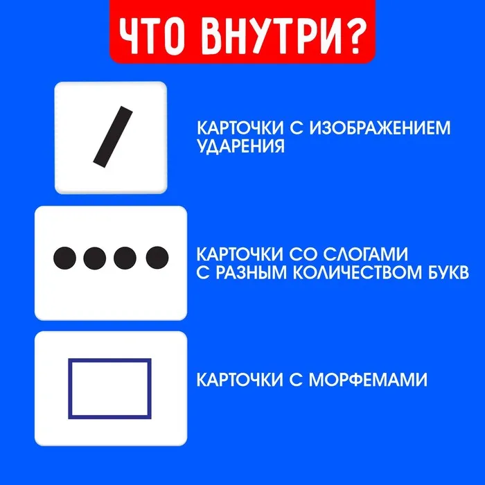 - 28 плотных карточек с закруглёнными краями помогают детям разобраться в сложной теме. Каждая карта демонстрирует отдельные элементы: ударения, слоги различной длины и морфемы.
