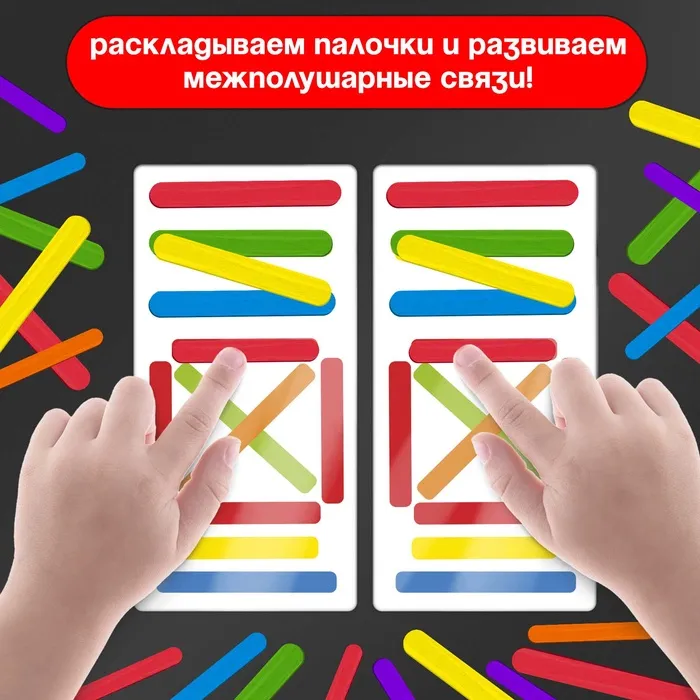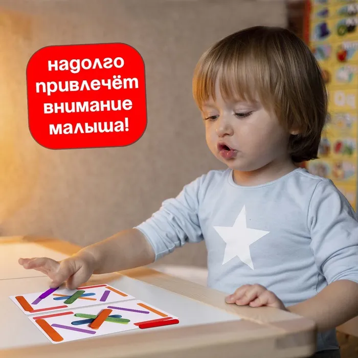 Развивающий «Разложи палочки» — это увлекательная игра для малышей от 3 лет, которая помогает освоить базовые навыки счёта и логики. Ребёнок изучает формы и размеры, строит различные узоры и фигуры.