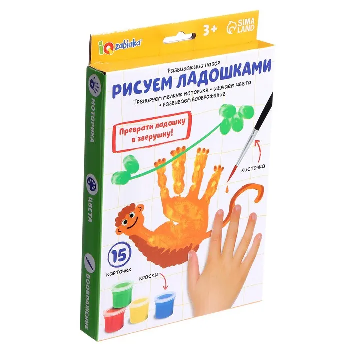 Набор разработан специально для малышей от 3 лет, и включает в себя 15 карточек, кисточку и баночки с красками.