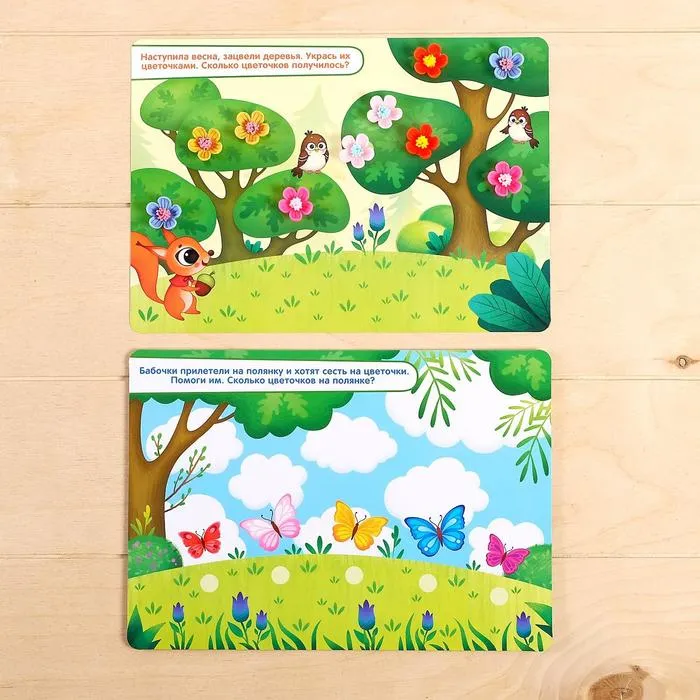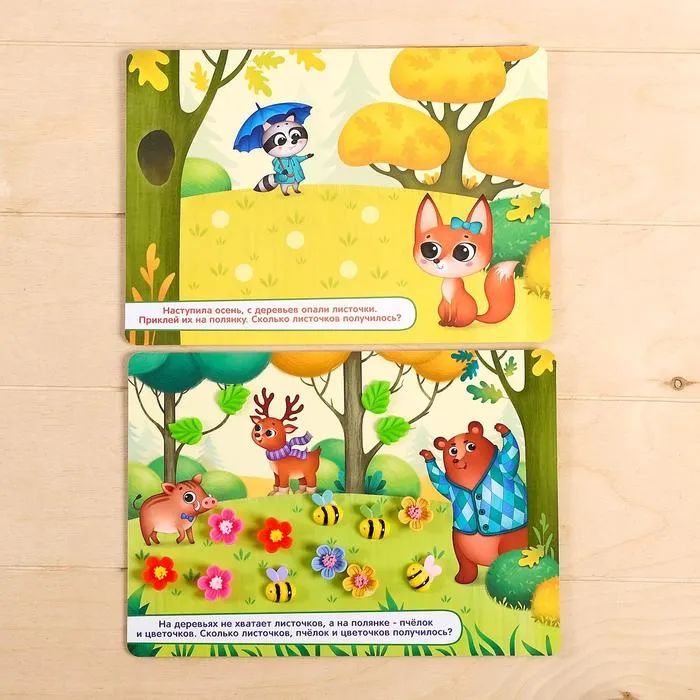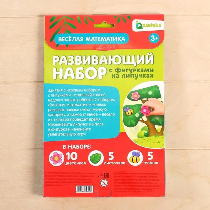 Развивающий набор «Весёлая математика» включает в себя: 4 игровых поля, липучки, волшебные фигурки: 5 пчёлок, 5 листочков и 10 цветочков.