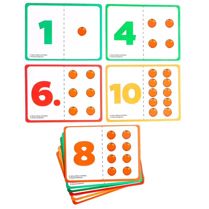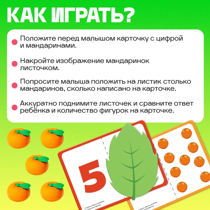 - Попросите малыша положить на листик столько мандаринов, сколько написано на карточке.