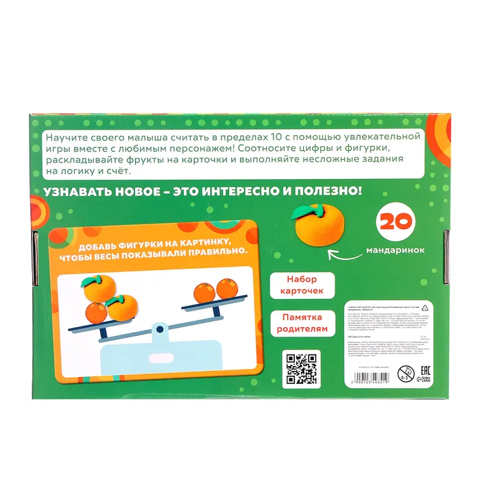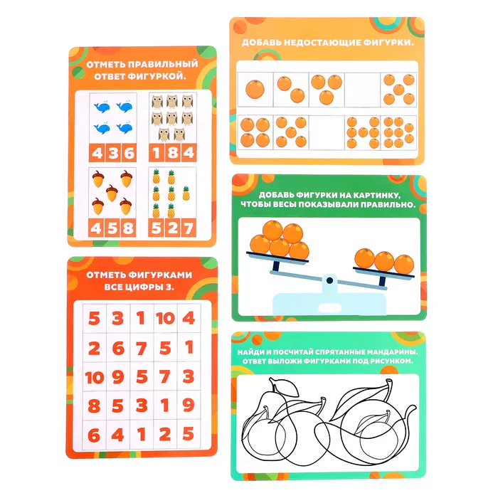 - 20 мандаринок и обучающие карточки — малыш соотносит число на карточке с количеством фруктов, тренируя память и внимание.