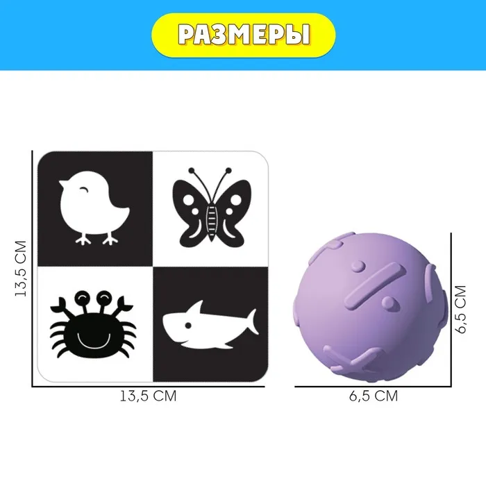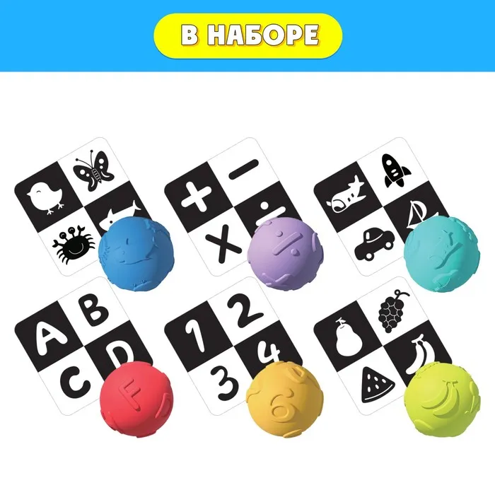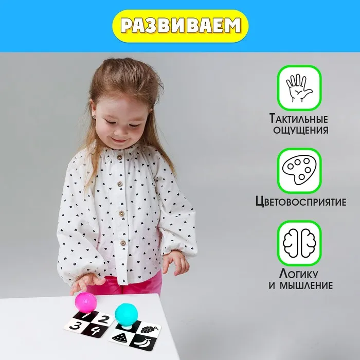 Внутри вы найдёте 6 чёрно-белых карточек и 6 цветных мячиков.