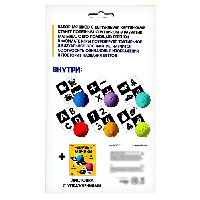 Развивающий набор «Сенсорные мячики» станет полезным спутником в развитии малыша. С его помощью ребёнок в лёгкой игровой форме потренирует тактильное и визуальное восприятие, научится соотносить одинаковые изображения и повторит названия цветов.