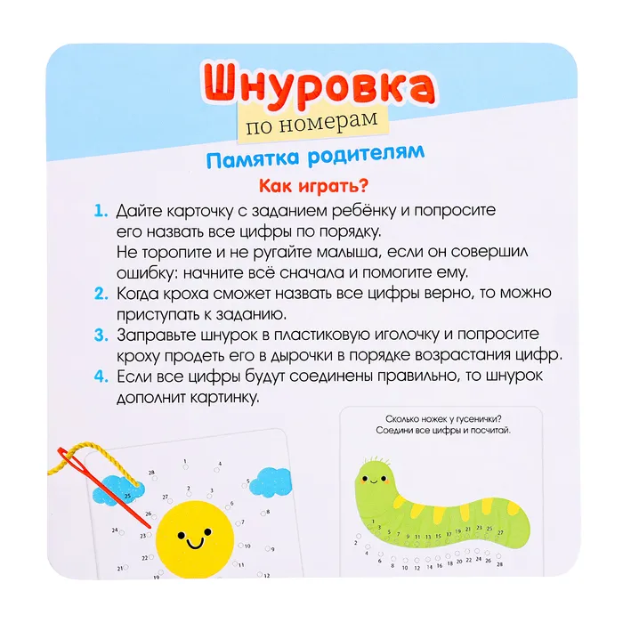 Развивающая игра «Шнуровка по номерам» поможет ребёнку освоить счёт до 30, потренировать внимательность и мелкую моторику. Процесс прост: нужно соединять цифры с помощью шнурка, постепенно дополняя картинку. Такое занятие увлечёт малыша и превратит обучение в увлекательную игру.