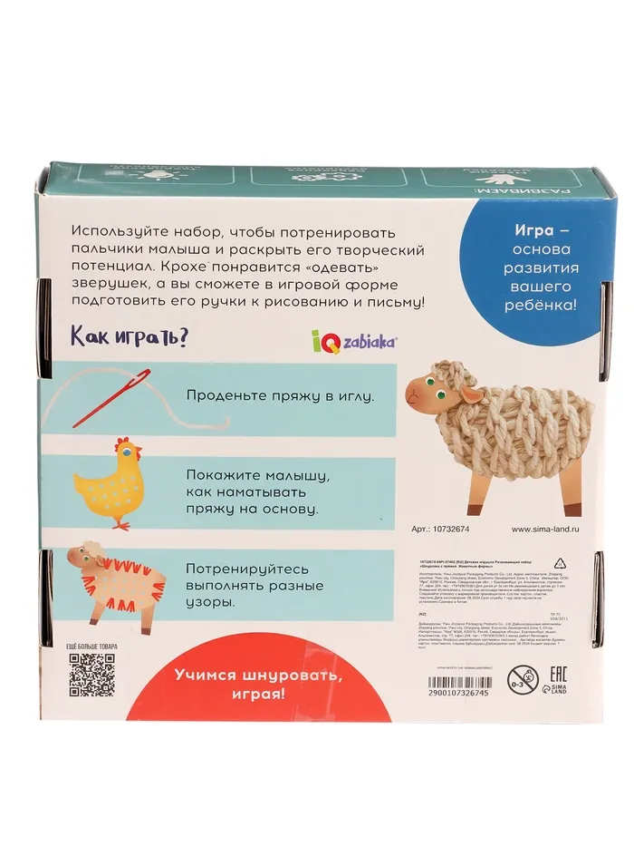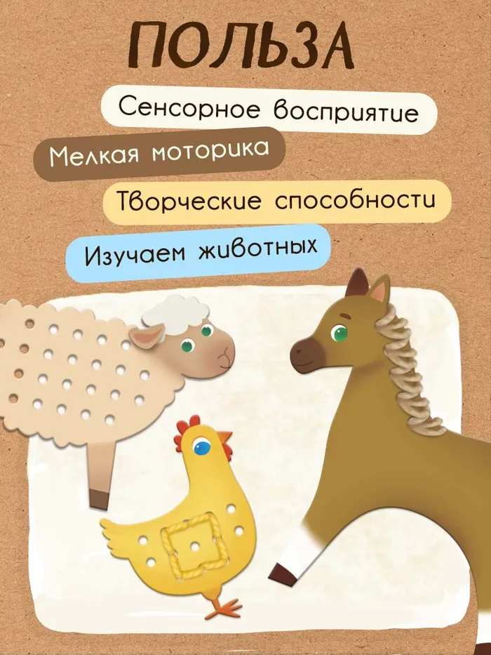 Развивающий набор «Шнуровка с пряжей. Животные фермы», 3+ — Характеристики