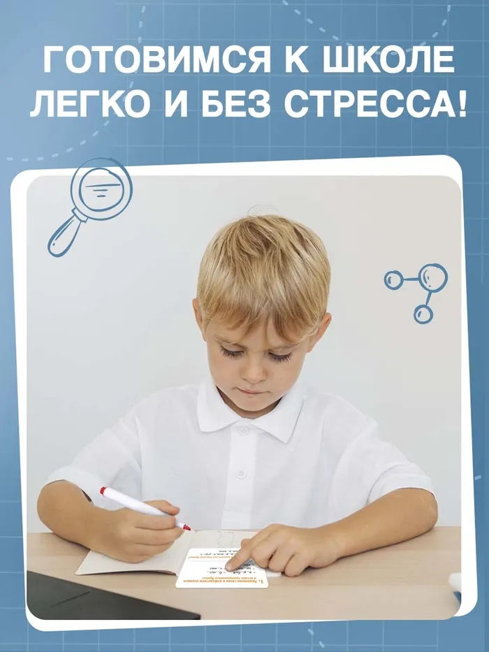 На каждой карточке вы найдете задание: ребёнку нужно выполнить упражнение, тренируя написание и понимание словарных слов. Благодаря стирающемуся маркеру задания можно выполнять несколько раз, что помогает закреплять знания и повторять материал без дополнительных затрат.