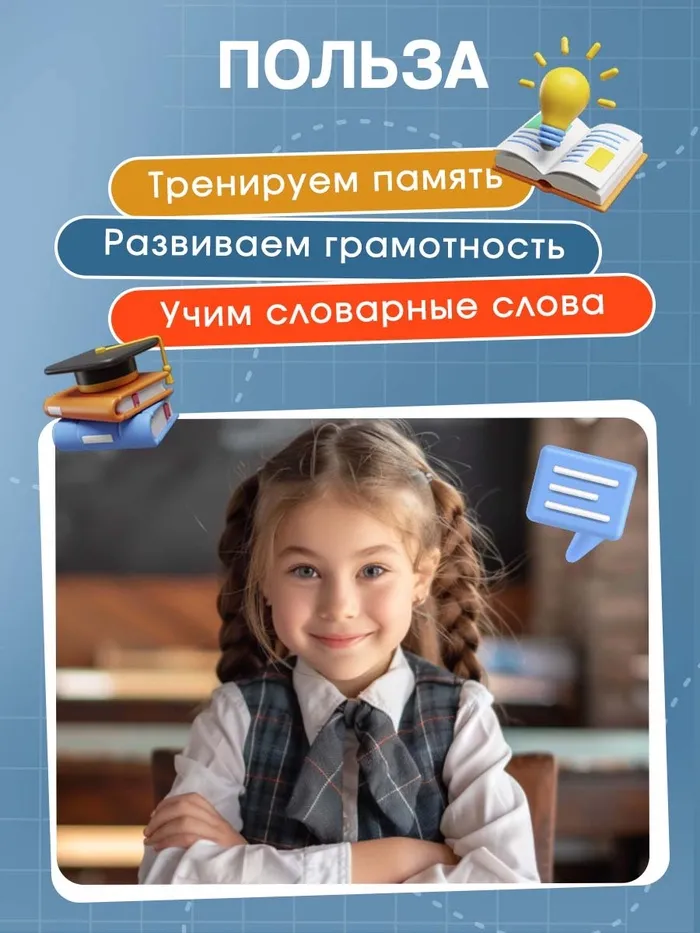 Обучающий набор «Словарные слова» — это удобный инструмент для изучения сложных слов русского языка. Он разработан специально для детей от 7 лет, чтобы развивать грамматические навыки и тренировать память в увлекательной игровой форме.