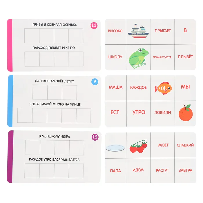 - Взрослый ведущий достаёт из колоды с предложениями карточку и зачитывает её. Сначала чётко проговаривает предложение, затем называет отдельные слова.