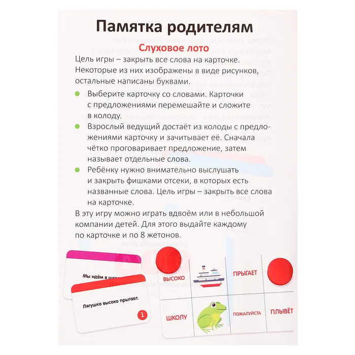 - Ребёнку нужно внимательно выслушать и закрыть фишками отсеки, в которых есть названные слова. Цель игры — закрыть все слова на карточке.