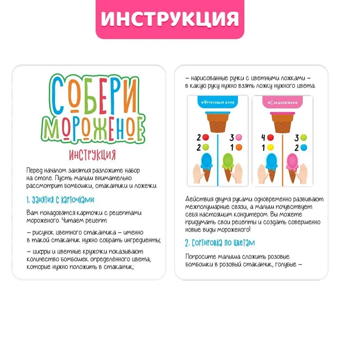 Внутри вы найдёте 30 разноцветных бомбошек, 3 стаканчика, 3 ложечки и карточки с заданиями.