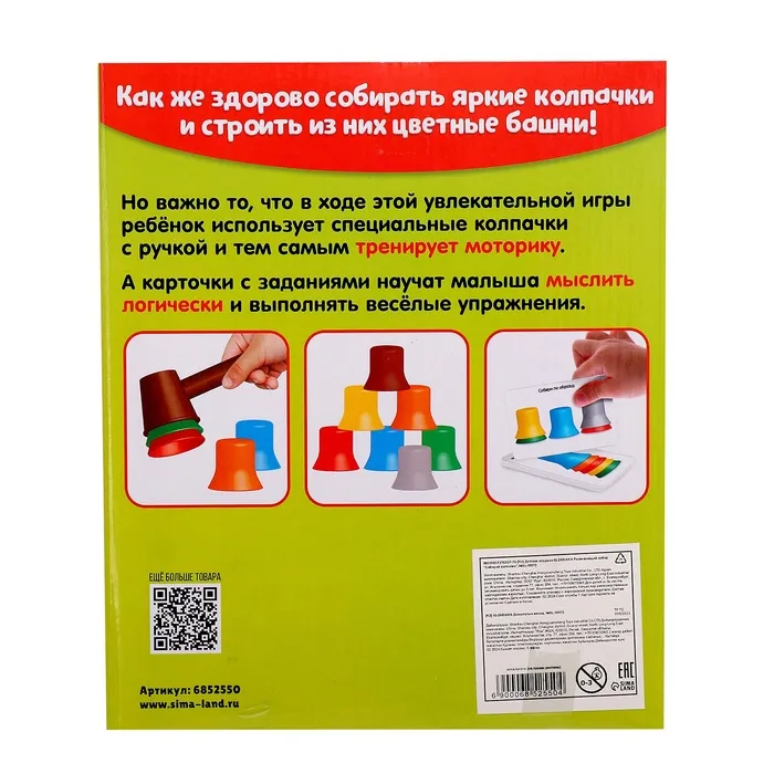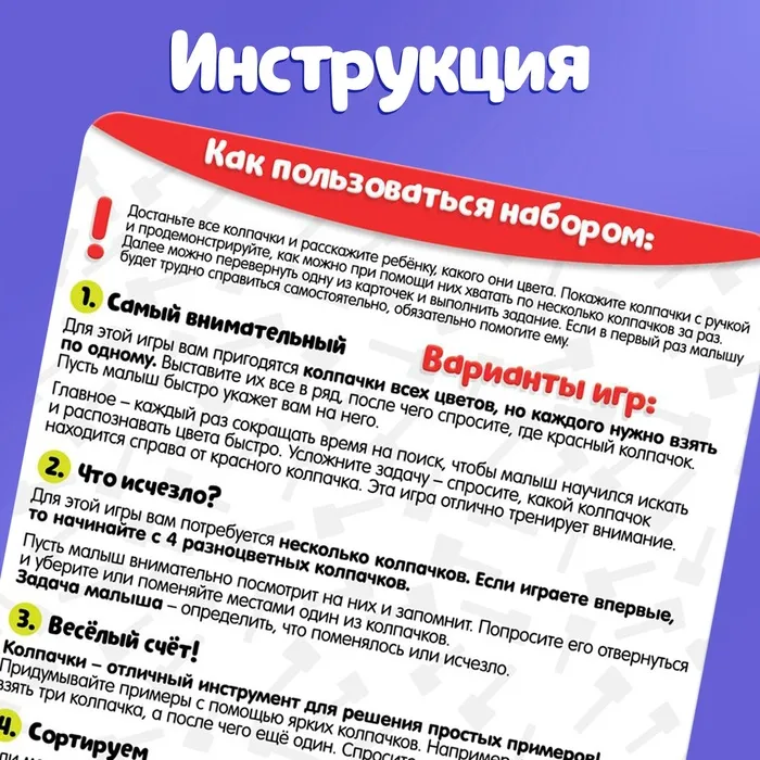 В процессе игры ребёнок взаимодействует с колпачками на ручках, тем самым тренирует мелкую моторику. Карточки с логическими задачками научат кроху мыслить быстро и правильно.