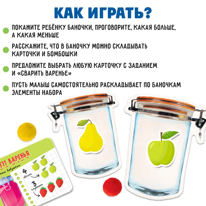 - Карточки и бомбошки легко вкладываются внутрь баночек и видны малышу.