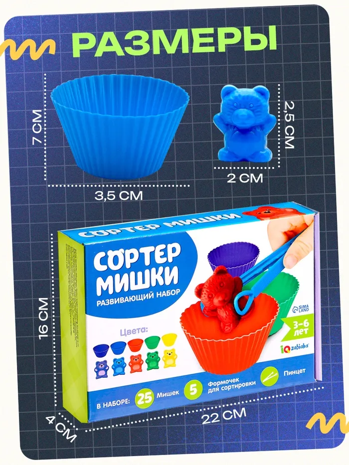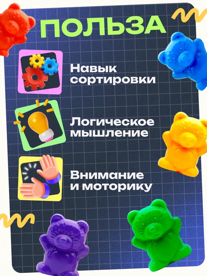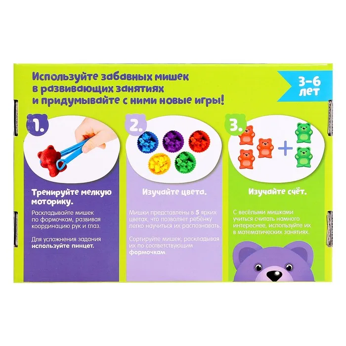 Игра создана для тренировки мелкой моторики, обучению цветам и счёту. Малыш будет раскладывать мишек пальчиками. Процесс можно усложнять, используя пинцет.