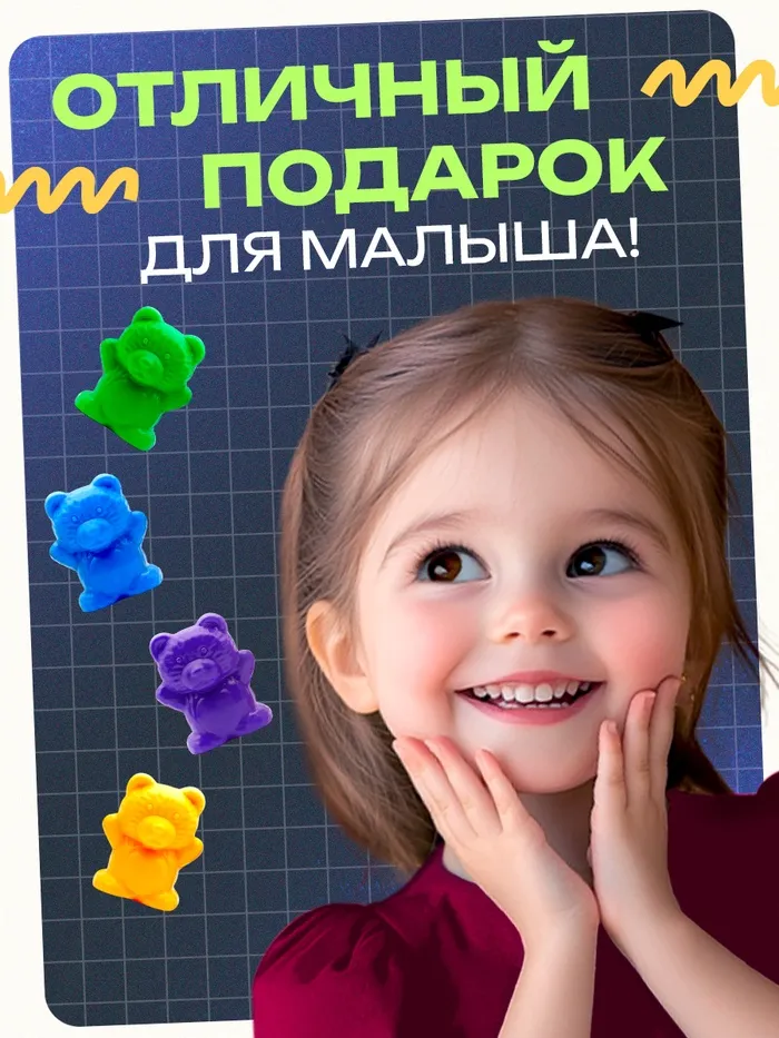 Попросите кроху посчитать количество мишек каждого цвета и разложить их по соответствующим формочкам.