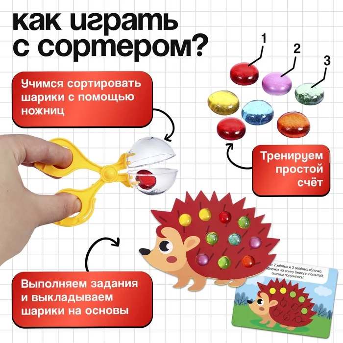 Игра с сортером помогает развить важные навыки. Сортировка элементов по форме или цвету улучшает логику и внимательность, а взаимодействие с шариками способствует укреплению мелкой моторики. Набор помогает ребёнку тренировать усидчивость и учиться находить решения игровых задач.