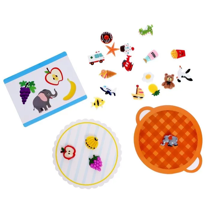 Попросите кроху доставать поочерёдно предметы и складывать по местам: на карточку-тарелочку — съедобные, а на корзинку-тарелочку — несъедобные.