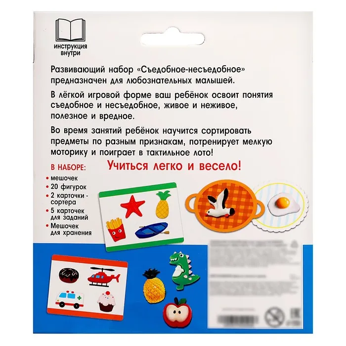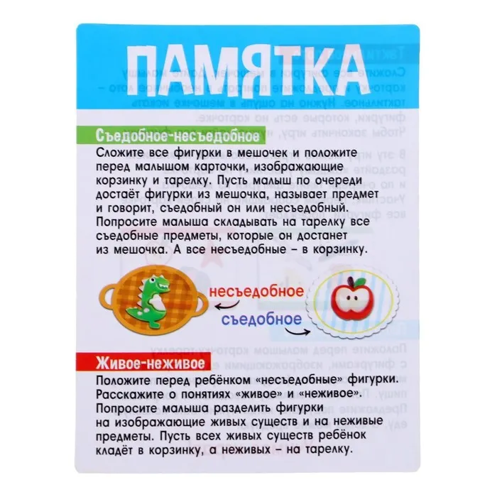 Занятия с обучающими карточками познакомят малыша с понятиями «съедобное» и «несъедобное» и помогут развить память, интеллект, зрительное и слуховое восприятие.