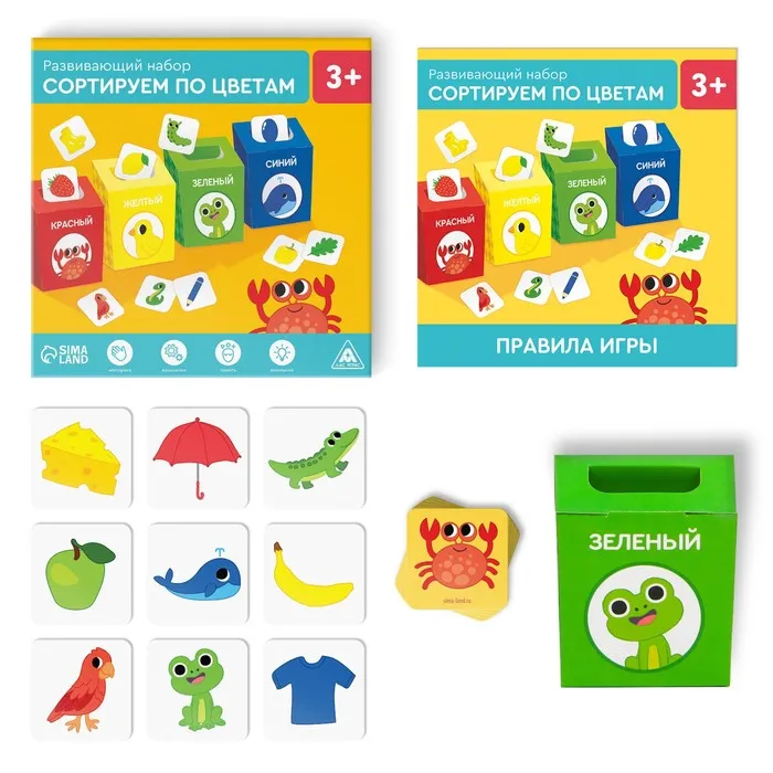 Ребёнок запускает руку в мешочек и достаёт первую попавшуюся карточку. Вместе произнесите, что на ней изображено и какого это цвета. Теперь задача ребёнка — поместить карточку в контейнер того же цвета, что и предмет или животное на карточке. На каждый контейнер приходится по 15 карточек этого цвета.