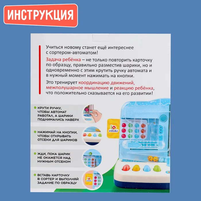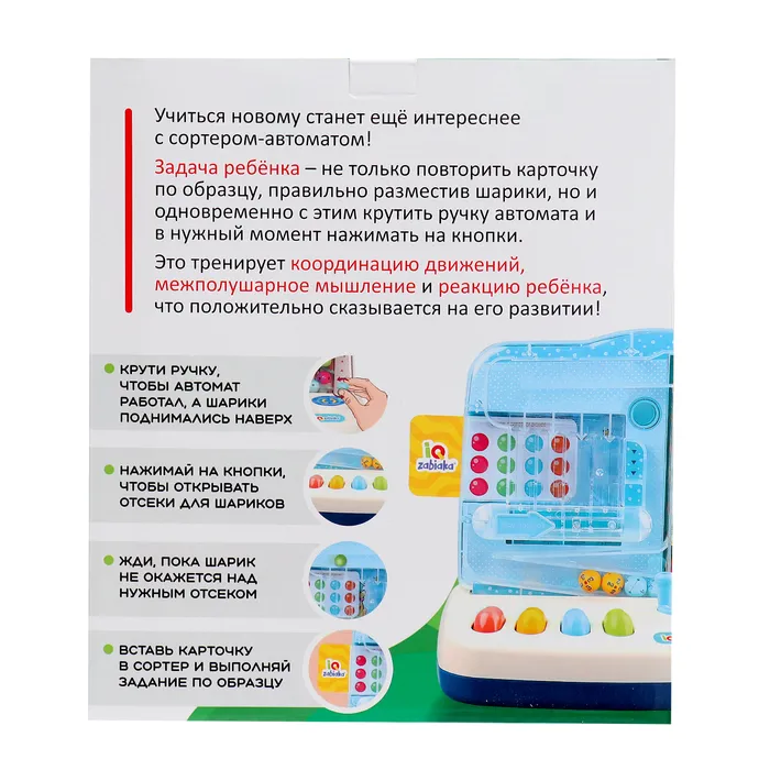 Задача ребёнка — не только повторить карточку по образцу, правильно разместив шарики, но и одновременно с этим крутить ручку автомата и в нужный момент нажимать на кнопки.