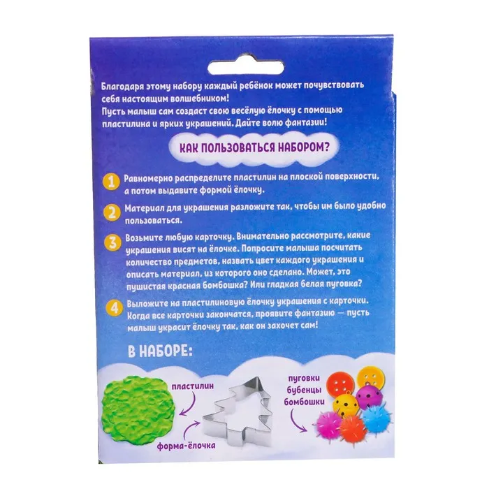 Благодаря этому набору ребёнок почувствует себя настоящим волшебником! Малыш создаст свою ёлочку с помощью пластилина и ярких украшений.