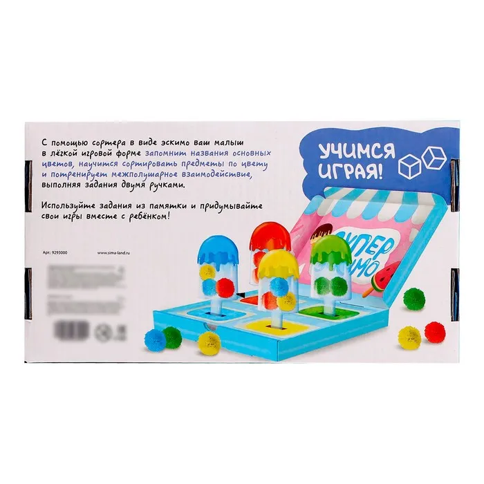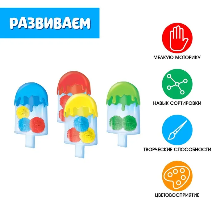Развивающий набор «Суперэскимо» поможет ребёнку в лёгкой игровой форме запомнить названия основных цветов, научиться сортировать предметы по цвету и потренировать межполушарное взаимодействие, выполняя задания двумя руками.