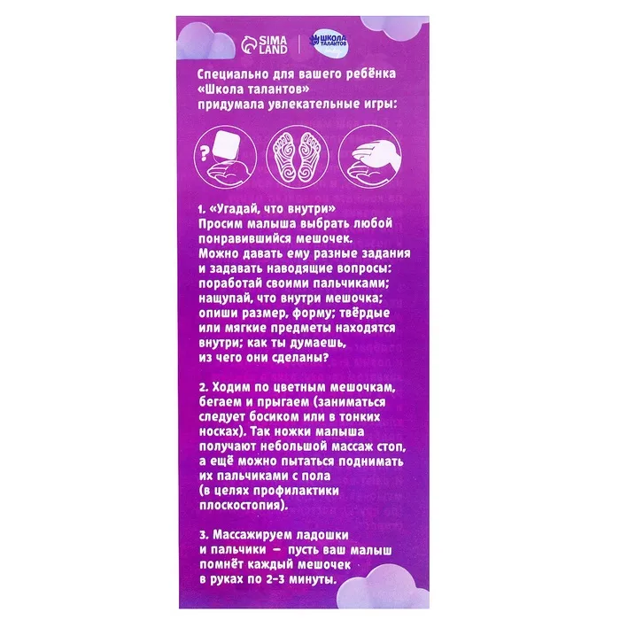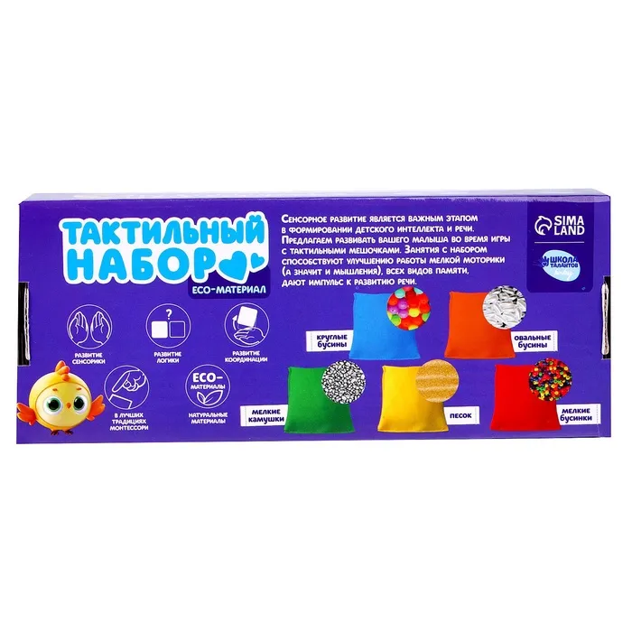 моторики рукмозжечковой стимуляциимежполушарных связейвниманияпамятитактильной чувствительностиловкости рукКаждый мешочек сшит из экологичного материала и имеет индивидуальное наполнение: овальные бусины, круглые бусины, мелкие бусины, песок, мелкие камушки.