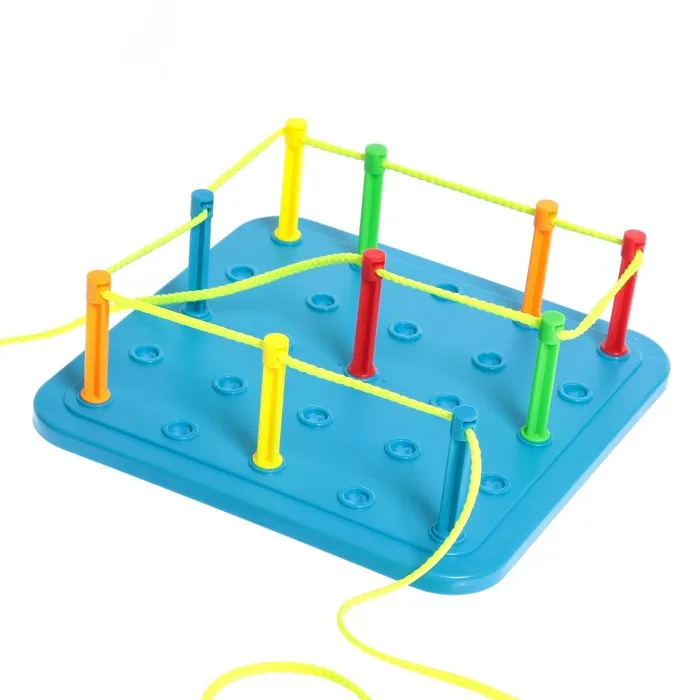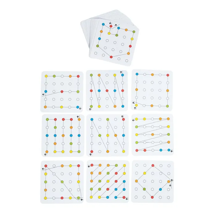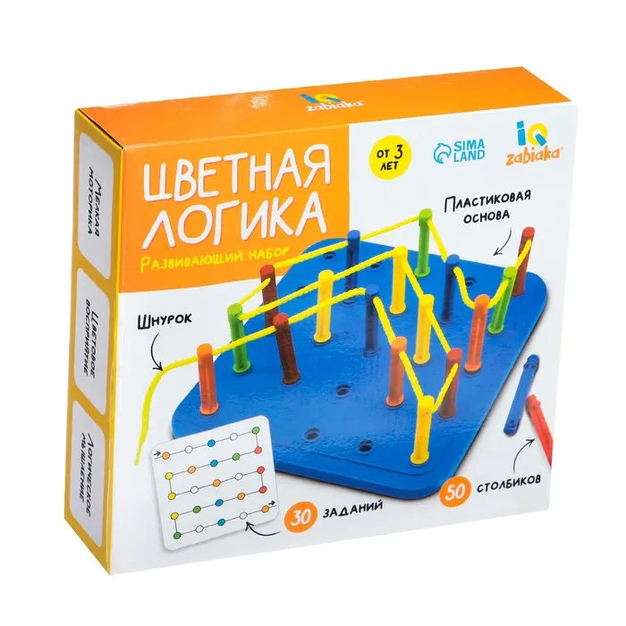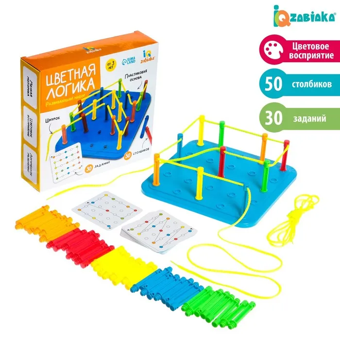 - Внутри вы найдёте пластиковую основу, длинный шнурок, 50 цветных столбиков, и карточки с 30 заданиями.