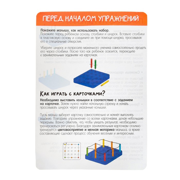 - Задача малыша — выставить столбики и соединить их шнурком в соответствии с заданием на карточке.