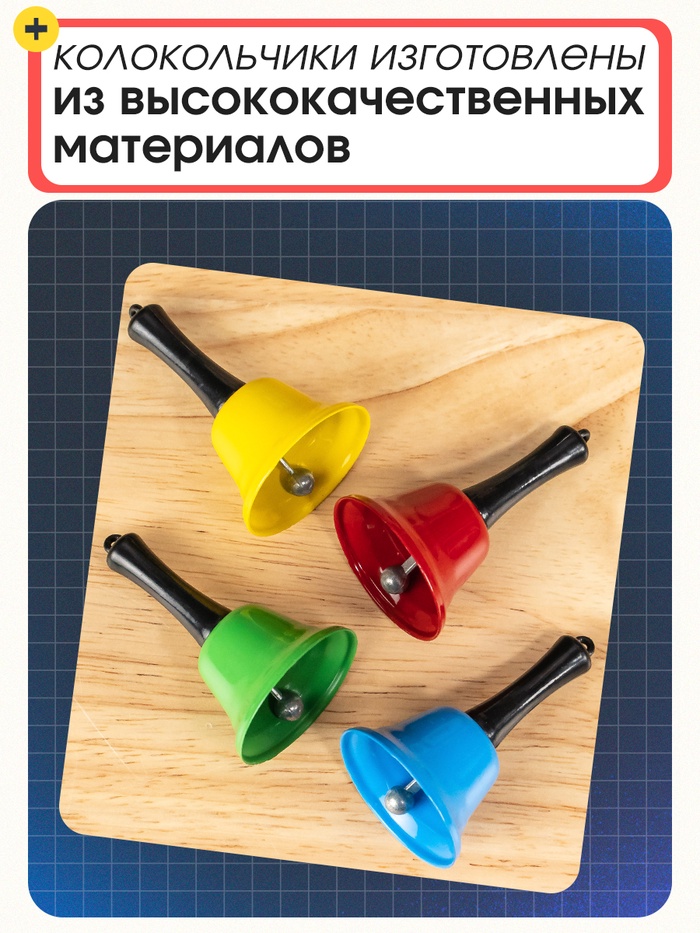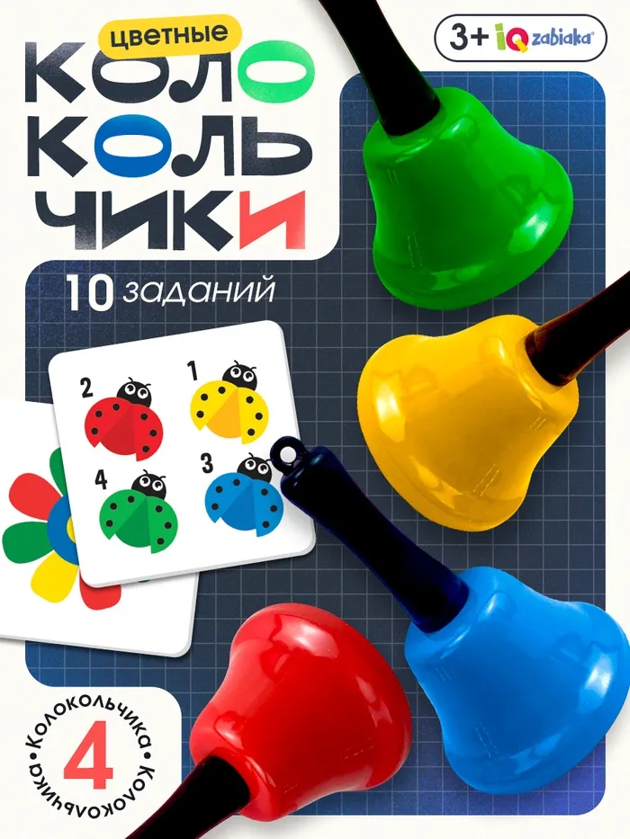 Развивающий набор станет любимой игрушкой вашего ребёнка. В нём малыш обнаружит 4 цветных звонких колокольчика. Они помогут ему запомнить цвета, цифры, научиться считать и решать много полезных заданий с карточек.
