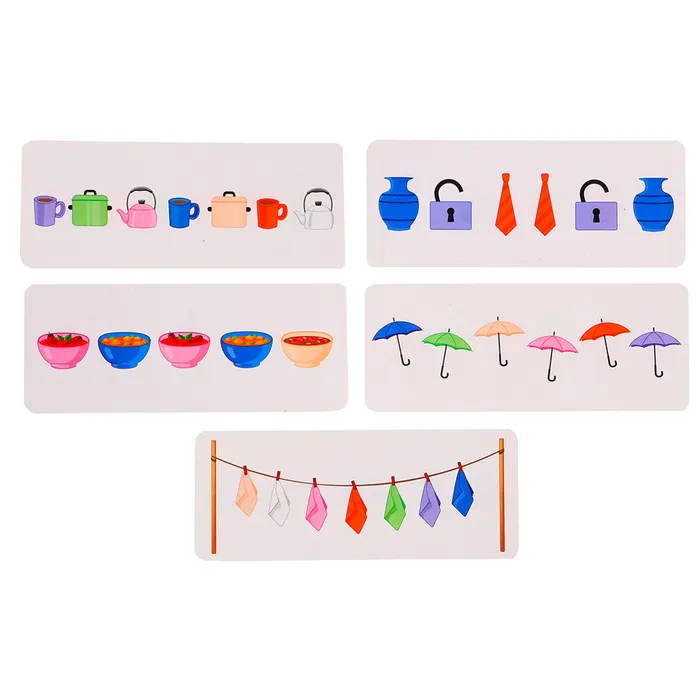 - Тренируем счёт: положите карточку перед ребёнком. Попросите малыша посчитать предметы на карточке и развесить на прищепках столько же платочков.