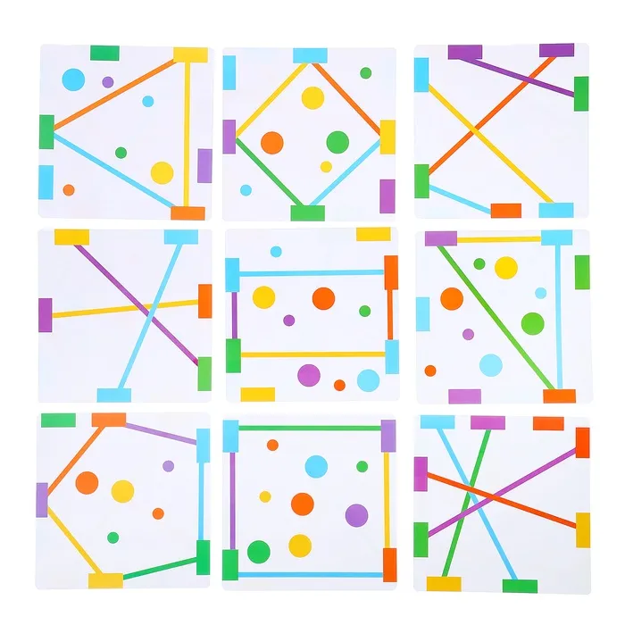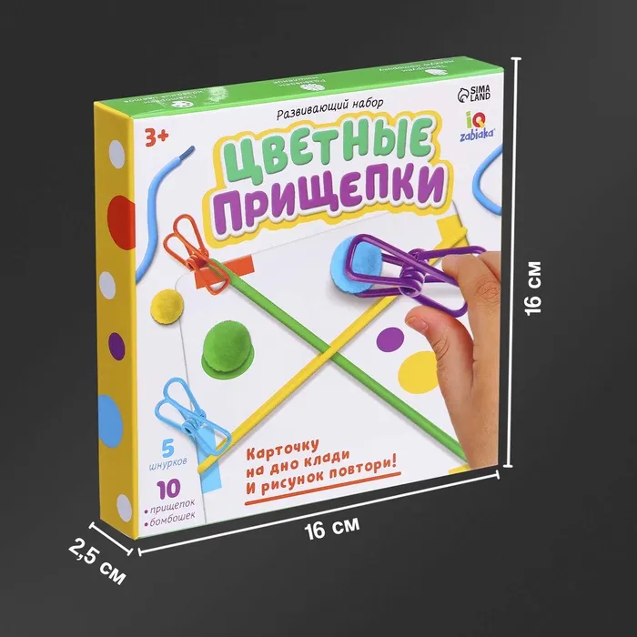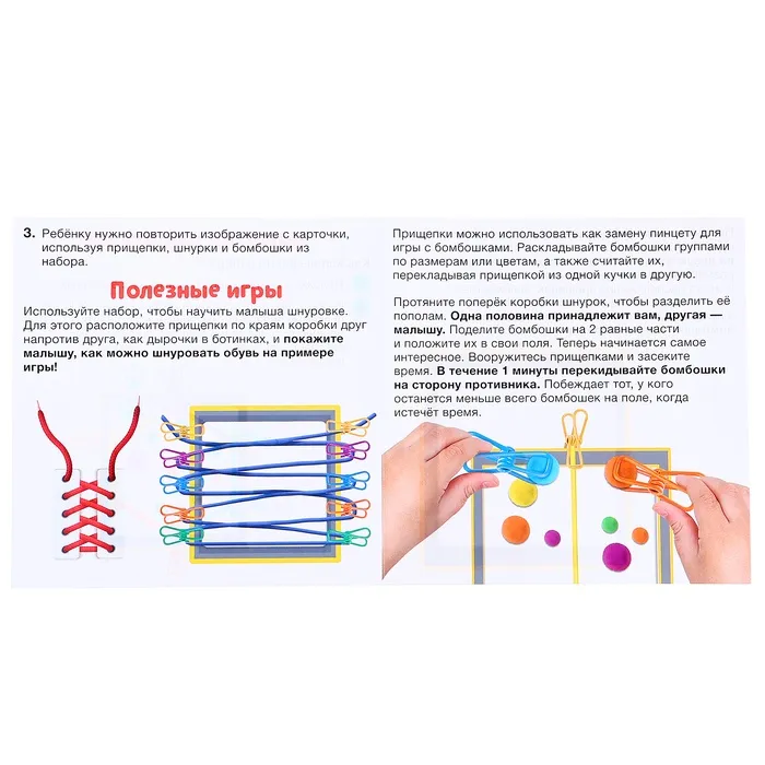 - В комплекте разноцветные прищепки, шнурки, бомбошки и карточки с заданиями.