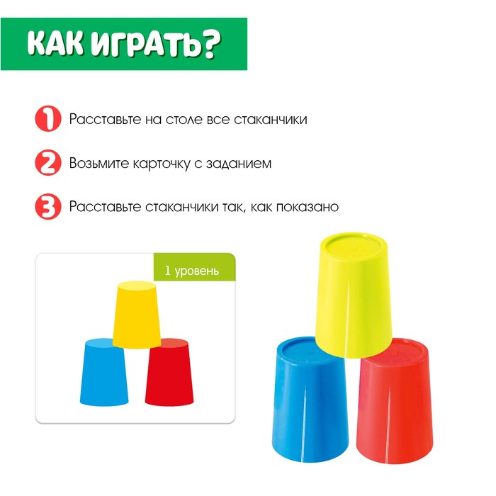 В комплект входит 20 заданий, 8 стаканчиков и инструкция.