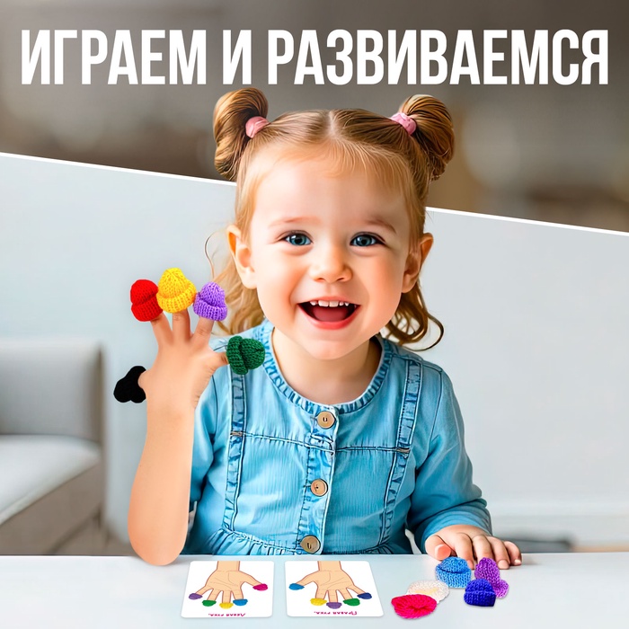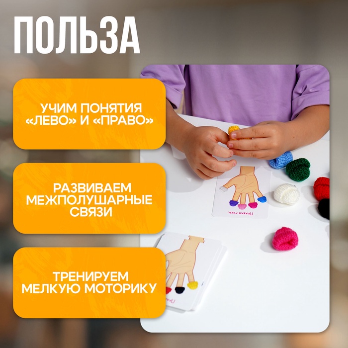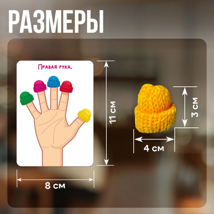 - Попросите кроху надеть шапочки на пальчики в порядке, как указано на карточке. Будьте внимательны, не перепутайте правую руку с левой.